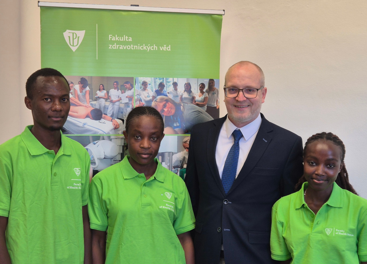 Trio studentů z univerzity v Nairobi s proděkanem FZV UP pro zahraniční vztahy a internacionalizaci Lukášem Merzem. Foto. archiv L. M